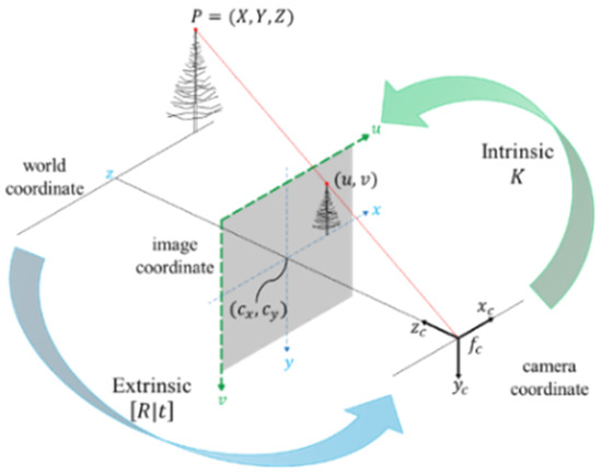 (A) Camera calibration: To project the 3D point cloud of LiDAR onto the 2D image, we must first obtain the mathematical model of the camera projection. Camera calibration is the process of finding the projection matrix that converts world coordinates to image coordinates. To find the correlation between the three-dimensional geometric position of a point on an object in real space and its corresponding point in the image, establishing a geometric model of the camera is necessary [24]. The world coordinates are converted to camera coordinates using the camera’s external parameter matrix and projected onto the 2D image using the camera’s internal parameter matrix. The projection process is shown in Figure 3.