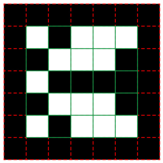 (B) LiDAR-Camera Calibration: To find the transformation between LiDAR and the camera, we need to use two sets of 3D points that correspond to each other. The camera image provides one set of 3D points, and the other is the LiDAR 3D point cloud. Finding the corresponding correspond between these sets of points yields [ R | t ] . The camera can only provide 2D RGB images; thus, to generate 3D information using the camera, our research uses ArUco Markers as AR labels [26]. Figure 4 is a schematic of ArUco Markers. The green grid lines in the figure represent the internal 5 × 5 coded area, and the red grid lines represent the outer border. The grid lines serve as indicators, and the actual labels do not have grid lines.