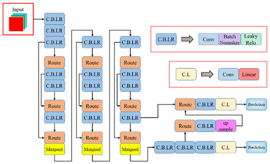 (A) Network architecture: Our research utilises the YOLOv4-Tiny [23] network for obstacle recognition. As a detection network, its main purpose is to reduce the complexity of the network and improve the efficiency of computations to achieve real-time computing. The architecture comprises 21 convolutional layers, 11 routing layers, 3 pooling layers, one upsampling layer and two prediction layers. The YOLOv4-Tiny architecture diagram is shown in Figure 5. The CBLR block in the figure is composed of convolution, batch normalise and the Leaky Relu activation function. The CL block is composed of convolution and the linear activation function.