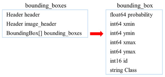 For ease of system integration, this research uses darknet_ros as the YOLO execution environment. Three topics will be published in darknet_ros: the number of detected objects found_object, the bounding box matrix bounding_boxes and the image with the bounding boxes drawn detection image; only the first two are actually used in this research. The bounding box matrix contains the data of multiple bounding boxes. YOLO may simultaneously detect one or more targets and integrate the data of multiple bounding boxes into the topic to enable other systems to obtain the prediction data easily. The data structure is shown in Figure 7. Data provided by bounding box is different from the original bounding box drawn by YOLOv4-Tiny, which directly provides the centre point, width and height of the box. Instead, it provides the upper left corner (xmin, ymin) and lower right corner (xmax, ymax) coordinates of the bounding box in the image.