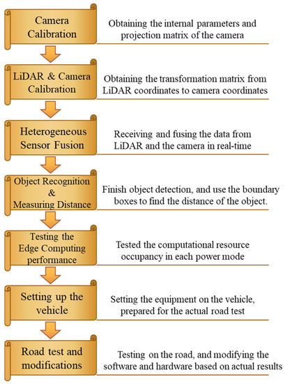In this research, we use the Velodyne VLP-16 and the Logitech HD Webcam C525 as sensors and the NVIDIA Jetson AGX Xavier as the edge computing platform. First, we find the rigid body transformation between the two sensors through 3D–3D point matching. Then, we project the 3D point cloud image onto the 2D image and write the programme with the ROS Package to achieve real-time processing. We also tested the hardware resource occupancy in each power mode when the completed system is executed on Jetson AGX. Finally, we performed a dynamic test on the actual road. Figure 8 shows the steps of the experiment conducted in this research and the goal of each step.