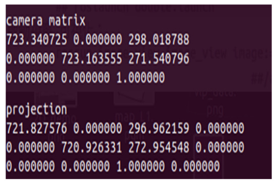 In order to achieve the fusion of image and 3D point cloud data, it is necessary to correct the camera and 3D LiDAR to find out the conversion relationship between the two data. Before performing the joint calibration of LiDAR and the camera, we obtain the internal parameters and projection matrix of the C525 camera through the Camera_Calibration toolkit in ROS. Figure 9 shows the internal parameters and projection matrix of the C525. This maps to Equation (1) camera internal matrix and camera external matrix in preparation for joint correction.