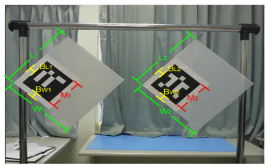 Next, we prepare the calibration board with the ArUco Markers and suspend it. Figure 10 shows the suspension of the calibration board and size markings. In the figure, L and W represent the length and width of the calibration board, respectively, and BL and BW represent the distance between the ArUco Markers and the edge of the calibration board, respectively. Finally, M represents the side length of the ArUco Markers. Table 2 shows the detailed specifications of the three calibration plates used in this research.
