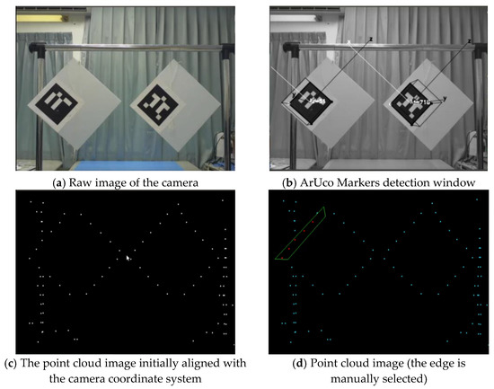 We start the joint calibration after obtaining the camera internal parameters and projection matrix and preparing the calibration plate. This research focuses on using two and three calibration plates to calibrate and compare the results. Figure 11 shows the four windows during joint calibration: (a) shows the raw image of the camera; (b) is the ArUco Markers detection window; (c) is the point cloud image filtered by reflection intensity and initially aligned with the camera coordinate system; and (d) is the point cloud image where the edge is manually selected. The green frame is the manual boundary, and points within the selected boundary will turn red while the rest will remain blue. When calibrating, we start from the calibration board on the left, starting from the upper left edge and finishing selecting the four edges in clockwise order. Then, we select the next calibration board.