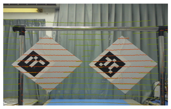 After the LiDAR and the camera are jointly calibrated, the transformation matrix between the two can be obtained. The 3D point cloud of the LiDAR can be instantly projected onto the 2D image of the camera using the ROS Package designed in our research. Figure 14 and Figure 15 show the projection results using the transformation matrix obtained via the joint calibration. The color of the points in the figures represents the distances. The nearer a point, the redder it becomes, and the further away, the greener it becomes. In Figure 15, three calibration plates are used to obtain the transformation matrix. Compared with Figure 14, the deviation of the projection of Figure 15 is more obvious. Therefore, points cannot be accurately projected onto the correct position.