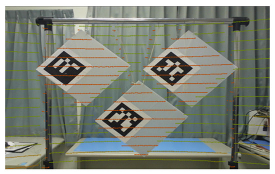 When using three calibration plates, for the camera’s and LiDAR’s fields of view to accommodate three calibration plates simultaneously, the distance between the sensor and calibration plate must be increased to 134 cm, and fewer VLP-16 laser rays scan each calibration plate. This reduces the number of point clouds on the edges. Figure 13 shows the calibration results of using three calibration plates. The Root Mean Square Error (RMSE) of the final conversion is approximately thrice than that when using two calibration plates, and the deviation in the actual final projection is also more obvious.
