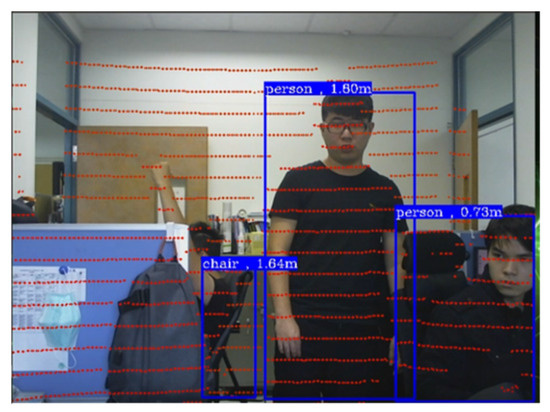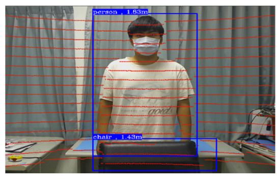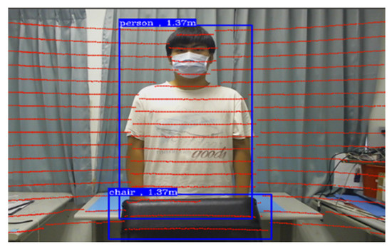 For recognising obstacles present ahead, the image input size is 640 × 480 pixels and the total number of YOLOv4-Tiny categories is 80. In our experiment, we use the weights provided by the official weight file. Then, we find the distance to the object using the information given by the bounding box. Figure 15 uses the minimum point in 100% of the bounding box. This method ensures that we find the shortest distance between the sensor and the object but is more susceptible to environmental interferences. In the obstacle anti-collision system, the point with the smallest distance within the bounding box is used as the target distance. This system avoids bulges and the unevenness of the obstacle to detect the first point of collision of the obstacle, and it has the most straightforward and fastest computations. However, this method affects distance detection when two objects overlap. For example, in Figure 16, the chair interfered with the human body, resulting in an inaccurate distance.