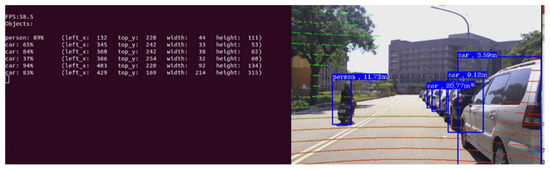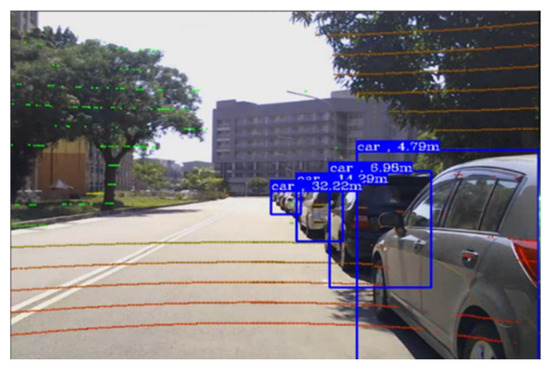 Figure 19 shows the results of the actual dynamic test on the road. The effective detection distance of LiDAR is 100 m, and the detection error is less than 3 cm. Within 10 m, the average obstacle detection accuracy of YOLOv4-Tiny dynamic detection can surpass 70%. Through this experiment, it can be concluded that the system proposed in this article can be applied to the ever-changing environment on the road.