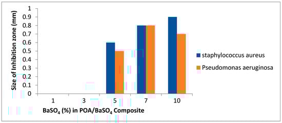 The POA/BaSO4 nanocomposite that inhibited Pseudomonas aeruginosa growth was found to be optimal at 7% (Table 3 and Figure 6). Similarly, Staphylococcus aureus growth was inhibited by the POA/BaSO4 nanocomposites. The maximum inhibition was associated with 10% of the POA/BaSO4 nanocomposites against Gram-positive bacteria (Staphylococcus aureus). Nanoparticles have a small size, a larger surface area than bulky particles, and better penetration; therefore, they have a greater bactericidal effect. The specific process by which nanoparticles enter bacteria is unclear; however, studies have shown that treating bacterial cultures with nanoparticles alters the shape of the membranes and significantly increases membrane permeability, impairing normal transport through the plasma membrane. Bacterial cells die when they are unable to manage the transport across the plasma membrane. It was believed that due to their small size, barium-sulphate nanoparticles enter the bacterial cell membrane and link to functional groups of proteins, causing denaturation. They are also hypothesized to cause bacterial cell death by interacting with phosphorus and sulphur compounds, such as DNA. Total bacterial inhibition was proportional to BaSO4-nanoparticle concentrations []. It was found that the BaSO4 nanoparticles have a significant antibacterial activity, which may be utilized for practical uses.