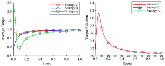 As shown in Figure 2, strategies A, B, and C are used to calculate the torque pulsation corresponding to different speeds under constant magnetic potential, and these values are standardized to obtain the comparison diagram of average torque and torque pulsation under the three strategies.