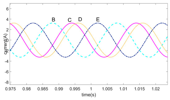 When the input voltage is 80 V, the current waveform after the open-circuit fault and the current waveform after fault-tolerant control are shown in Figure 11, Figure 12, Figure 13, Figure 14, Figure 15 and Figure 16. A, B, C, D and E in the figure are the representative of the current phase.