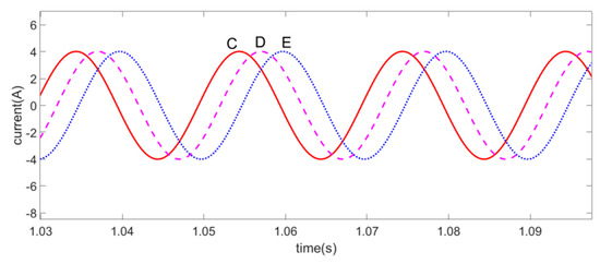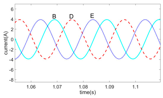When phase A and B of a five-phase motor are an open-circuit fault, the schematic diagram of the other three-phase currents is shown in Figure 6. After being controlled by the fault-tolerant control strategy proposed in this paper, the schematic diagram of the remaining three-phase currents is shown in Figure 7.