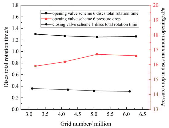 Using 3D modeling software pro/E constructs the whole flow passage of the dual disc check valve. Numerical calculations were performed using ANSYS/Fluent software. To ensure the availability of the numerical model, the upstream and downstream sections of the valve, respectively, extend five times the nominal diameter of the valve. As shown in Figure 3, adopting unstructured tetrahedral cells meshes the whole flow passage. The meshes of the fluid domains of the great curvature transition flow passage and the near-wall carry out refined processing. This numerical simulation uses a dynamic mesh technique, where the valve disc is in rapid motion, causing constant changes in the fluid domain. Unstructured meshes allow better mesh reconstruction and better adaptation to the fluid domains. In addition, it becomes easier to refine the local meshes. As shown in Figure 4, the mesh cells of different sizes carried out mesh independence checks, considering the calculation accuracy and efficiency of the computer, and the initial total number of cells was determined to be about five million. The dynamic mesh whose generation method adopts elastic smoothing and local reconstruction has a minimum cell size of 0.5 mm and a maximum distortion rate of 0.75.