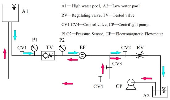 As shown in Figure 6, the main components of the testing system of the dual disc check valve include a high water pool A1 (20 m from the tested valve), low water pool A2, centrifugal pump CP (rated head: 50 m, rated flow: 200 m3/h), pressure sensor P1/P2 (range: −0.1–1.5 MPa, accuracy: 0.25%, the measured pressure points are set at a position of 5 times the diameter of the pipe (200 mm) from the tested valve), electromagnetic flowmeter EF (specification: DN200, range: 0–300 m3/h, accuracy: 0.21%), data acquisition system (sampling frequency: 6400 Hz), regulating valve RV, control valve CV, tested dual disc check valve TV. Figure 7 shows the built experimental setup.