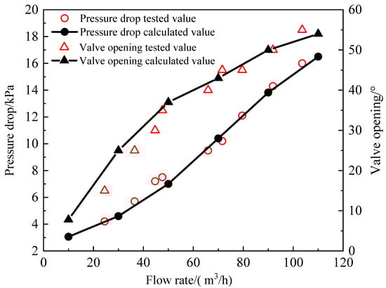 As shown in Figure 10, the pressure drop increases significantly as the flow rate grows. That is because when the flow rate increases, the average flow velocity escalates; namely, the kinetic energy loss grows when the fluid passes through the valve, which causes the pressure drop between the two sides of the valve to enhance. However, as the flow rate increases, the valve opening angle rises remarkably to 35°, then the flow rate continues to increase, and the valve opening angle improves slowly. The following reasons can explain this situation. According to Formulas (9) and (10), the impact torque of the fluid acting on the valve discs under a few flow rates is small and needs to overcome the spring preload torque to open the valve discs. When the valve opening is small, it has less negative feedback on the impact torque of the fluid and spring torque. As the flow rate increases, the impact torque of the fluid grows significantly, and the valve disc opening enhances remarkably. However, when the flow rate increases to 50 m3/h, the valve disc opening is 35°. At this time, the valve opening has a vigorous negative feedback on the impact torque of the fluid and spring torque. So the flow rate continues to increase, the impact torque of the fluid improves scarcely, but the spring torque significantly increases, and the valve disc opening grows barely.