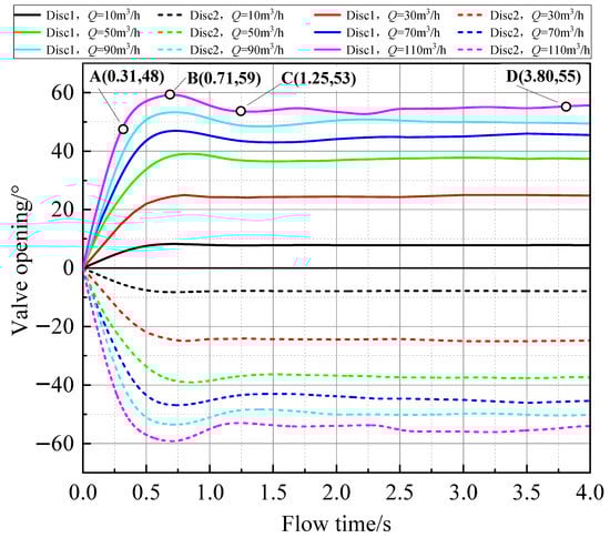 As shown in Figure 11, when the flow rate is different, each stage of the valve opening process is different. In the 0A stage, with the flow rate increase, the valve disc’s opening angular velocity increases, and the valve is opened more quickly. In the AB stage, with the growth of flow rate, the valve opening increases, and the curve’s curvature enlarges (the angular acceleration enhances). In the BC stage, with the growth of flow rate, the return of opening increases. In the CD stage, with the rise in flow rate, the oscillation amplitude of the opening increases.