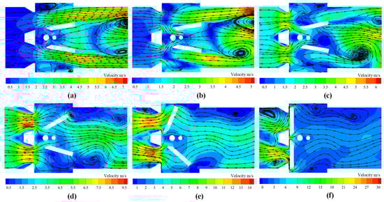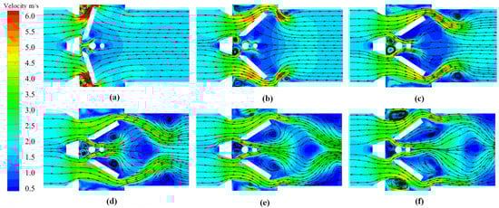 The instantaneous flow field diagram of the valve opening, Scheme 6. (a) Flow time = 0.1 s; (b) Flow time = 0.3 s; (c) Flow time = 0.5 s; (d) Flow time = 0.7 s; (e) Flow time = 0.9 s; (f) Flow time = 1.1 s.