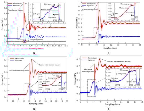 Figure 15 shows the transient pressure-tested curves at different valve-closing times. As can be seen, when the valve is in the fully open position, the pressure upstream and downstream is almost equal and remains constant. As shown in Figure 15a, the downstream pressure begins increasing at point A and transmits to the upstream through the check valve. In the AB stage, the upstream and downstream pressures increase simultaneously, and the fluid decelerates with the check valve closing gradually. At point B, the upstream and downstream pressures no longer increase, and the flow stops. In the BC stage, the upstream and downstream pressures fluctuate slightly or remain constant with the check valve’s closing, and a reversal flow occurs whose velocity continues to increase. At point C, the flow stops instantaneously with the check valve slamming, the upstream pressure reduces drastically, and gradually returns to the pressure value of the high water tank. However, the downstream pressure increases sharply with the water hammer beginning to occur at point C, reaches the pressure peak of the water hammer at point D, then gradually subsides and stabilizes at point E [21,22].