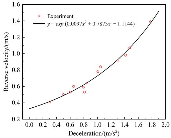 Figure 16 is the dynamic characteristic curve of the dual disc check valve. As can be seen, the maximum reverse flow velocity of the check valve increases as the fluid deceleration of the pipeline system increases, and the changing trend fits well with the exponential functions y = exp (0.0097x2 + 0.7873x − 1.1144). When the deceleration of the pipeline system is a definite value, the smaller the maximum reverse flow velocity, the lower the water hammer pressure peak causing the check valve to close, and the better the water hammer protection performance of the check valve. Figure 16 reflects that this check valve has better water hammer-protection performance when deceleration is lower.