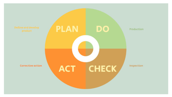 The PDCA (also known as Deming cycle, Shewhart cycle) is well known as a simple lean manufacturing tool, enabling companies to focus on continuous improvement. Thus, it is considered as an approach to developing process improvement at the organizational level. This, in turn, will affect the companies’ practices for solving problems, managing changes, and updating their working procedures and practices accordingly [47].
