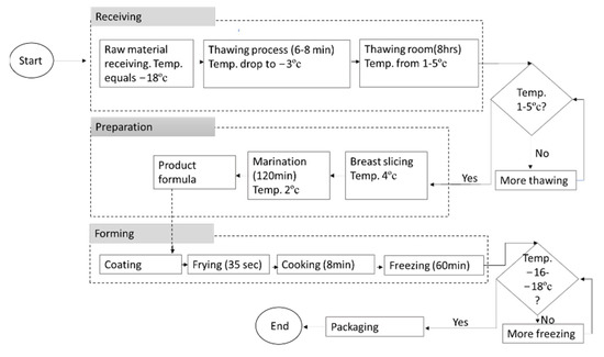 In this phase, the product and the production line under investigation are identified, and a process flowchart is created to provide insights about the process under consideration. Data are also collected to identify factors affecting the quality characteristics of interest, and their levels. Outputs of interest were also determined, and a systematic plan for process optimization was established. The product selected for investigation is the pre-cooked chicken fillet. The product passes through several processes, each of which includes several inputs and a number of both controllable and uncontrollable factors. According to the standard operating procedure, the product passes through the receipt of raw materials, preparation, forming, and packaging, as shown in Figure 2. A thorough research revealed that the forming process—which also includes coating, frying, cooking, and freezing—is the major process of interest. Moreover, the investigation indicated the factors of interest, which include production speed, frying time, cooking time and coating ratio. The response variables considered for improvement include weight, color, final temperature, pick up and waste.