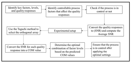 The systematic approach used for the optimization is established as shown in Figure 3. The orthogonal array is built for the Taguchi technique, where the rows correspond to the combination of experimentally utilized factor levels and the columns that correspond to the factors to be examined. Table 1 shows the levels for the studied factors. The quality characteristics are classified into three categories: smaller-the-better (STB), larger-the-better (LTB), and nominal-the-best (NTB). The levels are determined for each controllable factor within the specification limit, as shown in Table 1.