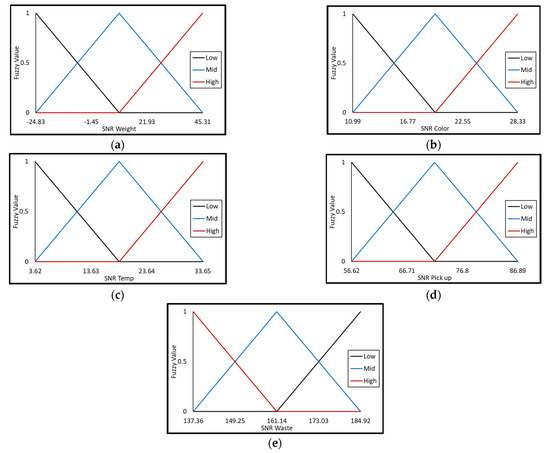 MFs for each quality response in the fuzzy system. (a) MFs for the weight quality response. (b) MFs for the color quality response. (c) MFs for the temperature quality response. (d) MFs for the pick up quality response. (e) MFs for the waste quality response.