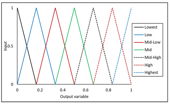 The responses are combined into a one single response using fuzzy inference in the Mamdani method; they served as inputs for the fuzzy system, as depicted in Figure 5. The fuzzification of the inputs shown in Table 10 requires the identification of three MFs as Low, Mid, and High, for each input. The MFs for the five quality responses are displayed in Figure 6. Then, the 243 rules were developed based on the quantity of fuzzy inputs, as indicated in Table 11. The rule aggregation is used to define the output MFs, as illustrated in Figure 7 and Figure 8. Seven MFs were used by the fuzzy system (Lowest, Low, Mid-low, Mid, Mid-high, High, and Highest). Each one of the output MFs has a different rule combination. For example, the Highest output MF has the rule that contains five High input MFs. On the other hand, the Lowest output MF has five Low input MFs. Table 12 represents the input combinations versus the targeting output MF. The defuzzification step includes converting the fuzzy values into a COM value, using the center of gravity method (COG). The COM values for the experimental combinations are shown in Table 13. After determining the COM values at the experimental combinations, the average COM values were found at each factor level as shown in Table 14, based on the highest COM value for each factor, where they represent level 1 for factor 1 (speed), level 3 for factor 2 (frying time), level 1 for factor 3 (cooking time), and level 1 for factor 4 (ratio).
