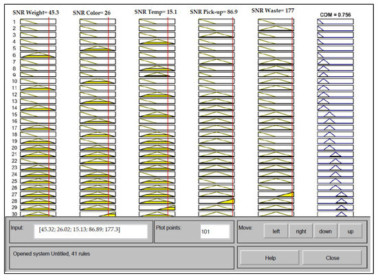 Several studies have explored the effects of process parameters on the output quality characteristics, using multi-criteria decision-making techniques and fuzzy logic in the food industry. In similar applications, some studies examined the optimization of process performance for other quality responses. For example, Hosseinpour and Martnenko evaluated the food quality by implementing multi-dimensional fuzzy sets. In their study, the authors investigated a shrimp production line. A total of 27 quality responses were considered in the study, which were combined in nine orthonormal vectors. The artificial neural networks approach was employed to convert the real time data into a multi-dimensional fuzzy inference system. Finally, a Multi-dimensional kinetic model was introduced to predict the food quality [50]. Vivek et al. proposed a new methodology for evaluating the food products quality, based on sensory quality responses. Five quality attributes (color, aroma, taste, mouthfeel, and texture) were merged, using a fuzzy inference system (additive rule models and non-additive rule models). The outcome from the fuzzy logic was extensively utilized to enhance the classification of the products into accepted and rejected products, along with weak and strong quality performance for both the existing and new food products [51].