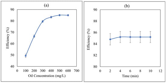 (a) Effect of the initial concentration of oil in PW on its removal efficiency by IL4 at Phase ratio (IL:PW) = 1:5, contact time = 5 min, and temperature = 25 °C, with σ = ±5.16 × 10−1%, (b) Effect of the contact time on the removal efficiency of oil by IL4. Initial concentration of oil 500 mg/L, phase ratio (IL:PW) = 1:5, temperature = 25 °C, with σ = ±2.68 × 10−1%.