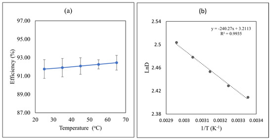 A temperature study is helpful for the determination of a suitable temperature range where the system can be applied. It also gives information about the exothermic or endothermic nature of the system. A thermodynamic study of the system can also be performed with the help of a temperature study. Temperature can affect the removal efficiency of oil from produced water. It is highly recommended that an extraction process that leads to high efficiency at a wide temperature range is more desirable for industrial applications. Therefore, in this work, the effect of temperature on the extraction efficiency of oil from PW using IL4 was studied. For this purpose, experiments were performed at different temperatures ranging from 25 °C to 65 °C at the optimum conditions of initial concentration of 500 mg/L, contact time of 4 min, pH = 8, and phase ratio = 4:1 (Figure 4a). Inspection of Figure 4a reveals that the extraction efficiency was slightly increased with the increase in temperature. This observation indicates that the extraction process is endothermic. Overall, there is no significant effect of temperature on the extraction efficiency of oil by IL4, hence, ambient temperature can be used to save energy and cost. A similar trend was reported in the literature for wastewater treatment using ILs [38]. Similar results were reported by Lakshmi et al. for the extraction of phenol and its derivates [39,48].