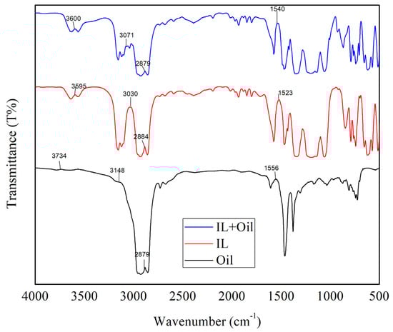 To study the interaction between oil and IL after oil extraction from PW, FTIR spectra were recorded for oil, IL, and IL-oil after extraction (Figure 6). For IL and IL-oil FTIR spectra, the peaks are identified as follows: the peaks in the region of 3500–3600 cm−1, 3050–3150 cm−1, and 2950–3000 cm−1 are due to the presence of a C-H single bond in IL. The peaks in the region of 2000–2100 cm−1 are due to the presence of the C≡C bond. The peaks present in the region of 1500–1650 cm−1 are due to the presence of C=C and C=N bonds. The peaks present in the region of 600–1500 cm−1 are associated with the fingerprint region that is hard to be associated with the complicated existing bonds. The extraction of oil from PW by IL resulted in an observed shift of the peaks of IL for C-H from 3595 to 3600 cm−1, and 3030 to 3071 cm−1 which represents the successful absorption of oil into IL. The peak for the C≡C bond shifted from 1523 to 1540 cm−1 which could be attributed to the incorporation of oil into IL. These shifts in the FITR peaks indicate that oil has successfully been removed from PW and has been absorbed by IL [41,49,50].