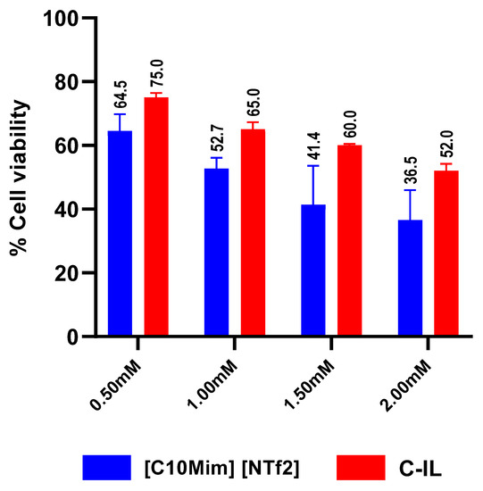 The cytotoxic effects of IL at different concentrations on human cells. Blue bars represent NTf2-based ionic liquid and red bars represent a commercial ionic liquid, i.e., IL 1-butyl-1-methylpyrrolidinium bis-(trifluoromethylsulfonyl)imide.