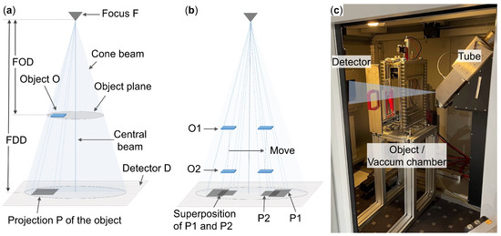 (a): Definition of basic terms of an X-ray inspection with cone beam. (b): Illustration of superposition and the effects of the central beam projection in a radiography. (c): Convetionional X-ray inspection machine and experimental setup for visualization of the electrolyte filling machine (cf. Section 5).