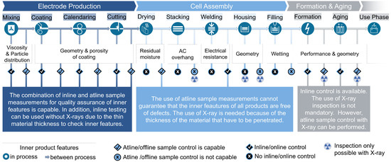 In electrode manufacturing, X-rays are primarily used to quantify the material properties inside or on the surface of the electrode at the molecular level. Due to the very extensive preparation of samples, these applications can be considered as destructive, atline or offline sample measurement methods. In fact, the offline measurements are very time-consuming and can only be implemented for small samples. However, destructive, offline sample measurements are acceptable, since this means only a small loss of material. Moreover, the combined control of inline and atline sample measurements gives a good indication of the overall quality of the batches. Adding to this, the overview shows that there is no need for using X-ray in electrode manufacturing for inline or online measurement processes. There are other principles of operation to inspect the inner intermediate product properties due to the thin material thickness of the products.