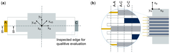In the lateral radiography of the ESC corner is performed with two different angles in the x0y0-plane at 130 kV, 45 μm and 200 ms exposure time. The experimental setups, X-ray images and corresponding CT slices are shown in Figure 5 and the X-ray image in the Figure 5c is taken along the short side of the electrodes. The sketch in Figure 5a shows the setup. In this configuration, the central beam propagates in the y0-direction. There is a superposition of the anodes and the cathodes in the beam direction. Therefore, it is not possible to clearly determine the corner positions. In addition, the inner cathodes can only be detected to a limited extent. The outlier C24 cannot be seen in this beam direction. Therefore, this visualization is not suitable for measuring the positions of the electrode corners in y0-direction. When the central beam propagates in the x0-direction, even more material is transmitted and even higher superposition is observable. In the second setup the corner of the ESC is transmitted diagonally as depicted in Figure 5b. In this resulting X-ray image (cf. Figure 5d), the central beam is rotated 45° around the z0 -axis and points in the direction of x45-axis. The superpositions are reduced mainly in the central beam region where the beam path is almost parallel to the electrode surface. Despite the parallax, distortion and superposition of several features all electrode corners can be detected in this diagonal lateral radiography. The offset position of the anodes can be clearly identified by comparing the Figure 5d,e. The outlier C24 in the x0-direction is also visible. However, it can be seen that there are significant variations between the electrode positions displayed in the different images. The direct comparison of the image Figure 5d and the CT slices Figure 5e–f shows that a displacement of the electrodes is just visualized in the rotated x45z0-coordinate system. This becomes particularly obvious when comparing the lower electrodes marked with a blue box and the minimum and maximum outliers. Other perturbations such as a damaged corner shape or a rotational deviation of the electrode corner additionally complicate a quantitative evaluation of the electrode corner position.