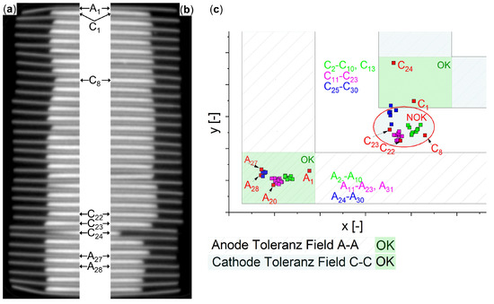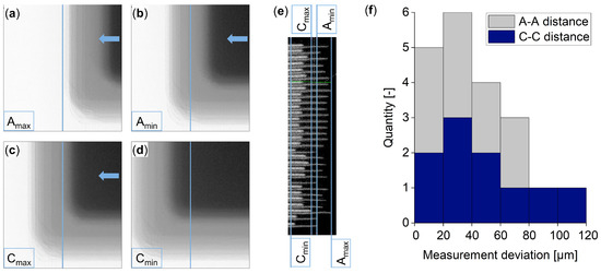 The qualitative evaluation of radiography with vertical beam direction shows a high potential that the maximum distances between outliers of anodes and cathodes can be measured even for a thick, large scale ESC. Reference measurements are made at the beginning using a CT of ESC corners with 30 compartments to assess the concept of vertical radiography. The selected ESCs have a high variation of electrode position. A digital resolution of 25 μm/voxel is achieved in the reference CT and a sample slice is shown in the Figure 7e. The data is manually analyzed. The method has a measurement accuracy for a distance measurement between electrode edges of ±50 μm because of the resolution. Next, an inspection of the identical ESC corners is carried out in the vertical beam direction. To realize this, a coordinate measurement with several images is implemented by focusing the central beam on the appropriate electrode edge in x0- and y0-direction. The ESC is moved manually orthogonally to the outliers of the electrode edges (marked in blue) as visualized in Figure 7a–d. Using the relative position of the portal axis system in the images show (traverse accuracy of ±1 μm) the anode distance A-A and cathode distance C-C can then be calculated from the coordination position of the points Amax, Amin, Cmax, Cmin. In the images an exposure time of 200 ms and a digital resolution of 5.08 μm/pixel are used. Repetitive measurements of the distances A-A and C-C show that an accuracy of approx. ±15 μm is achieved. Finally, the measurement data from CTs and coordination radiographies are directly compared. The relative deviation of 10 distance measurements between the CT measurements and the coordinate measurement in the vertical coordination radiography are shown in the diagram Figure 7f. This relative comparison of the measurement results from the CTs and coordination radiography results in a summed measurement accuracy of ±50 μm ± 15 μm = ±65 μm. It can be seen that for the anodes and cathodes almost all measurements have a maximum deviation of ±65 μm and thus lie within the summed accuracy. It is also evident that the measurement deviations for the anodes are smaller than those for the cathodes due to the clear visibility of the anode edges. Only for the cathode distances are relative deviations of the measurement results of more than ±65 μm present. This is attributed in individual cases to the low contrast of the edge of inner cathodes. In summary, the results show that a vertical coordination radiography can measure the maximum anode and cathode distances with a high resolution. The main challenge with this technique is the visibility of the inner cathode edge.