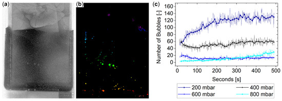 To evaluate the processed images, the contours in the image were extracted using the Canny algorithm [68]. The parameters of the Canny algorithm were set according to best practice rules and validated on individual images distributed over the time span of all videos of the process variations. Since various contours not belonging to the bubbles remain in the image even after the parameters of the Canny algorithm have been optimized, the binary image of the Canny algorithm is further filtered in the next step by using various operators (closing, opening, inversion, convex hull and flood fill). The contours remaining in the image after these filtering steps are finally filtered in terms of their size in pixels. The resulting image (example shown in Figure 10a,b) contains the detected bubbles. By counting the bubbles for each extracted image of each process variation, the bubble count curves over time shown in Figure 10c were generated.