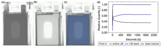Image processing for evaluation of fluid distribution in an evacuated LIB around 10 s after dosing the fluid. (a): Preprocessed input image. (b): Calibrated differential image. (c): Masked LIB areas. (d): Distribution of fluid in the LIB stack and dead volume over time.