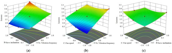 Response surface curves for the effects of the interaction terms against the losses. (a) Sieve inclination and vibration frequency response surface curve. (b) Fan and vibration frequency response surface curve. (c) Fan and sieve inclination response surface curve.