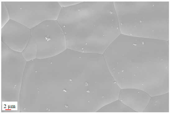 In order to prepare disc-shaped pellets, the powder was milled using a laboratory ball mill (planetary micromill Pulverisette 7, Fritzsch, for t = 3 × 10 min, with 500 rpm and a mass ratio of 1:10:60 powder:isopropyl alcohol:ZrO2 balls) and uniaxially cold-pressed at p = 283 MPa. After sintering at T = 1650 °C for t = 2 h the pellets were characterized using scanning electron microscopy (SEM, Ultra 55 FEG Carl Zeiss, Germany) and had a relative density of about 95% and an average grain size of about 20 µm (Figure 1). The samples were embedded in a cold-curing embedding agent (Technovit 5071, Kulzer) and polished with water-based diamond suspensions of 15, 6, 3, and 1 µm particle sizes. Then, the embedding agent was dissolved in acetone. The samples were cleaned with isopropanol and annealed. In order to prepare the samples for SIMS IELS measurements, they were newly embedded (Technovit 5071, Kulzer), cut, and dissolved again with acetone. Thereafter, the samples were inversely mounted (see Section 1, Figures S1 and S2 in the Supplementary Material, as well as references [35,36,37], for more details), cold-embedded (EPO-FIX, Struers), and prepared as described above.