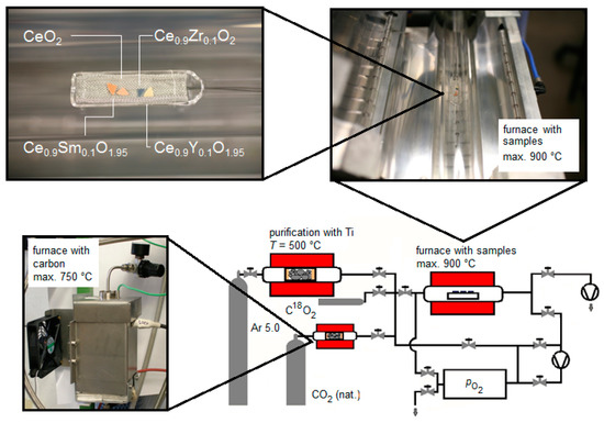 The cut, polished, and cleaned (ultrasonic cleaning in acetone followed by isopropanol) CeO2 and doped Ce0.9M3+/4+0.1O2-x (with M3+/4+ = Y, Sm, Zr) samples were annealed in a self-constructed experimental setup with an IR radiation heated furnace (Quad Elliptical, RI Controls/Research Incorporated), which allows fast heating rates of up to 100 K/s in the temperature range of 300 °C ≤ T ≤ 900 °C. The samples were placed on a coarse platinum mesh (avoiding contact of the platinum with the polished sample surface) in a quartz holder in well-defined atmosphere conditions (vacuum down to 10−9 bar, purified argon gas flow with ≤ 10−25 bar, oxygen isotope enriched gas mixture or other gas atmospheres being used), as shown in Figure 2. The oxygen partial pressure during re-oxidation experiments with CO2 is much lower in comparison to established experimental work using pure oxygen. The is controlled by the CO:CO2 ratio of the given gas mixture, by the respective temperature T and/or additional oxygen sources.
