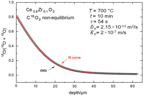SIMS line-scan depth profile for the 18O distribution of a 10 at-% Zr-doped ceria sample after an oxygen isotope exchange from C18O2 (Ar/C18O2 gas mixture) in non-equilibrium conditions at T = 700 °C. The oxygen isotope fraction is shown in comparison with the fit by Equation (3), together with the simultaneous determined non-equilibrium (chemical) values and .