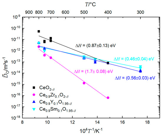 Determined chemical oxygen diffusion coefficients in ceria containing 10 at-% of dopants (Y, Sm, Zr) and in nominally un-doped ceria samples in the temperature range from T = 300 °C to T = 800 °C, together with calculated activation enthalpies.