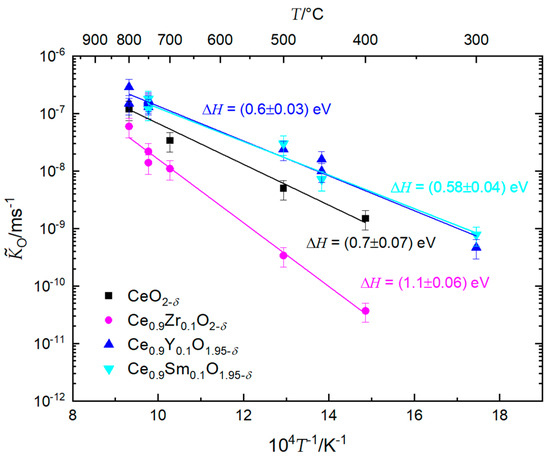 Determined chemical oxygen exchange coefficients in ceria containing 10 at-% of dopants (Y, Sm, Zr) and in nominally un-doped ceria samples in the temperature range from T = 300 °C to T = 800 °C, together with calculated activation enthalpies.