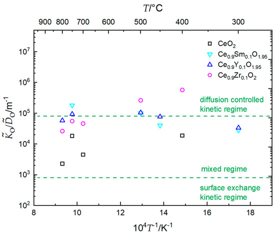The redox kinetics of ceria are either controlled by surface exchange reactions or by the bulk transport of oxygen. In the mixed kinetic regime, the observed kinetics of the reduction/oxidation process are influenced by the contributions of both parameters and . A deeper insight into mechanisms and kinetics of ceria reduction and re-oxidation with respect to the derived / data is given by calculating the characteristic dimensionless parameter of the kinetic regimes L with and h = sample thickness (in our case 1 mm), as discussed in [30]. In Figure 6, the derived / data sets from Section 3.1 are given for the respective temperature range, together with the calculated regime boundaries. The data reveal that non-equilibrium oxygen isotope exchange falls either into the diffusion-controlled range or in the mixed kinetic regime if the condition T ≤ 800 °C is given (if the sample thickness is about 1 mm). The / ratios tend to shift from the diffusion-controlled regime to the mixed regime with increasing temperature. The data extrapolation suggests that the surface exchange-controlled regime could be reached at temperatures well above 900 °C. These findings coincide with the results published by Knoblauch et al. [30], who discussed a surface-controlled kinetic regime at higher temperatures T ≥ 1300 °C for nominally undoped ceria (polycrystalline CeO2 of 1 mm thickness) that was investigated using thermogravimetric analysis in non-equilibrium conditions. In addition to that, Manning et al. [43] reported a surface-controlled kinetic regime for Gd-doped ceria already in the temperature range T ≤ 1100 °C. This was attributed to the fact that the trivalent dopant increases the concentration of oxygen vacancies and hence the diffusivity of oxygen rather than surface exchange kinetics.