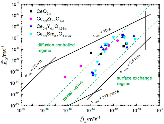 As discussed in [35], the simultaneous determination of oxygen diffusivity and surface exchange coefficient works well only in a certain window of experimental parameters, confined by feasible diffusional distances (30 nm < σ < 0.5 mm) and dwell times (seconds to years). Utilizing Equation (3) with the parameters discussed by Fielitz and Borchardt [35], an accessible K-D window for the simultaneous determination of and can be derived (Figure 7). The lines define a range of experimental parameters where a simultaneous determination is possible with acceptable errors.