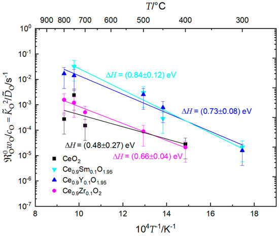 The influence of the kinetic regime on the apparent activation enthalpy of the surface exchange coefficient was later thoroughly discussed by Fielitz and Borchardt [53]. They suggest that the measured oxygen surface exchange coefficient, if measured in the mixed regime and in the diffusion controlled kinetic regime, depends not only on the equilibrium oxygen exchange rate at the gas/solid interface but also on the oxygen diffusion coefficient in the bulk (the reader is referred to Section 3 of the Supplementary Material for a full discussion on the correlation between KO and DO). As a consequence, apparent data are the mean values of the individual activation enthalpies and in case sufficiently thick samples were employed. According to this theory, can be estimated by the relation , which is shown in Table 3. The values range between 0.5 eV and 0.7 eV, which is in good agreement with the calculated activation enthalpies of the normalized exchange rates in Figure 8 within the experimental errors.