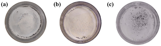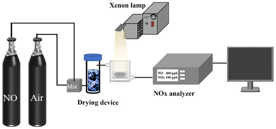 The photocatalytic setup consisted of a gas supply system, an airflow meter, the main reactor, a light source and the NOx analyzer. The gas supply system provided NO gas with a concentration of 100 ppm and clean dry air. The gases from the gas supply system were well mixed in the airflow meter at a gas flow rate of 300 mL·min−1, adjusting the NO concentration level at 700 ppb. The photocatalytic reactor was made from a cylindrical quartz reactor with the volume of 150 mL. The light source was a xenon lamp with a 420 nm cut-off filter, which was operated at 300 W and 20 mA to keep the light density and intensity consistent throughout the study. The NOx analyzer was able to track the concentration of both NO and NO2 continuously. First of all, 50 mg of the powder sample was uniformly dispersed in a Petri dish with 6.0 cm of diameter (Figure 1). A drying device was added prior to NOx analysis to remove water vapor from the inlet gas. All devices in the photocatalytic efficiency evaluating system were connected to polytetrafluoroethylene hoses, and each interface was sealed by sealing tape to ensure that there were no leaks in the system. The obtained coated dish was placed in the center of the photocatalytic reactor. The above-described setup for photocatalytic NO removal is schematically displayed in Figure 2. The photocatalytic efficiency, η, was calculated using the following equation: