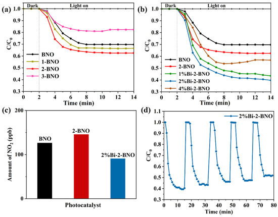 Photocatalytic activity of Bi3NbO7 with different contents of urea (a) and with different contents of Bi (b); NO2 generation over the BNO, 2-BNO and 2% Bi-2-BNO samples under visible light (c); results of the recycling experiments with the 2% Bi-2-BNO photocatalyst (d).